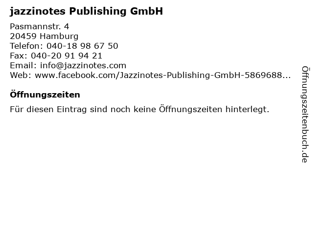 | Öffnungszeiten jazzinotes Publishing GmbH in Hamburg anzeigen | |