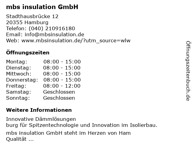 | Öffnungszeiten mbs insulation GmbH in Hamburg anzeigen | |