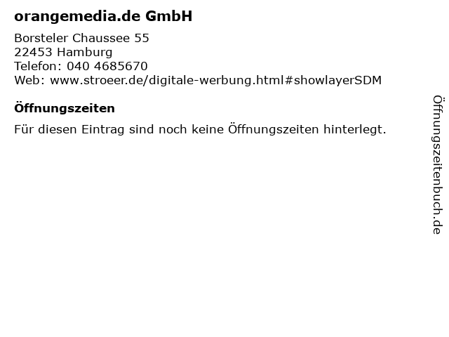 | Öffnungszeiten orangemedia.de GmbH in Hamburg anzeigen | |