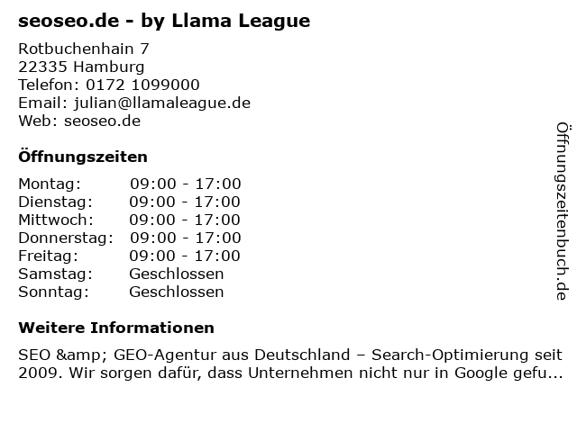 | Öffnungszeiten seoseo.de - by Llama League in Hamburg anzeigen | |