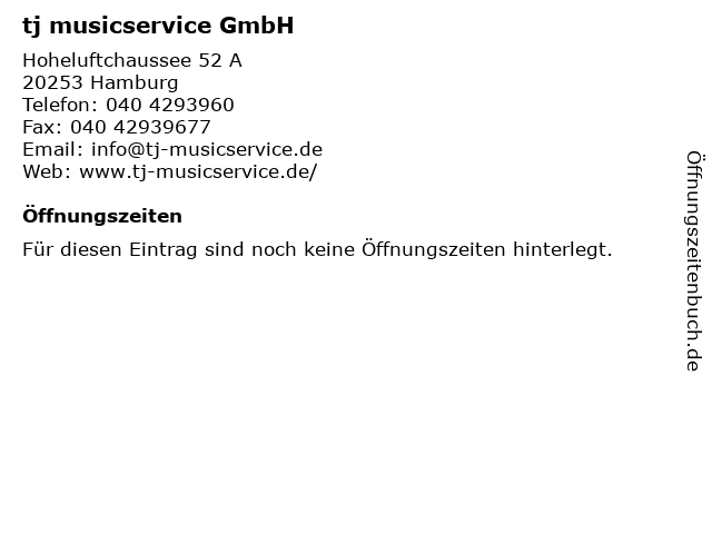 | Öffnungszeiten tj musicservice GmbH in Hamburg anzeigen | |