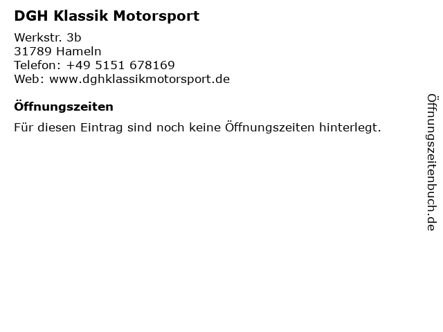 | Öffnungszeiten DGH Klassik Motorsport in Hameln anzeigen | |