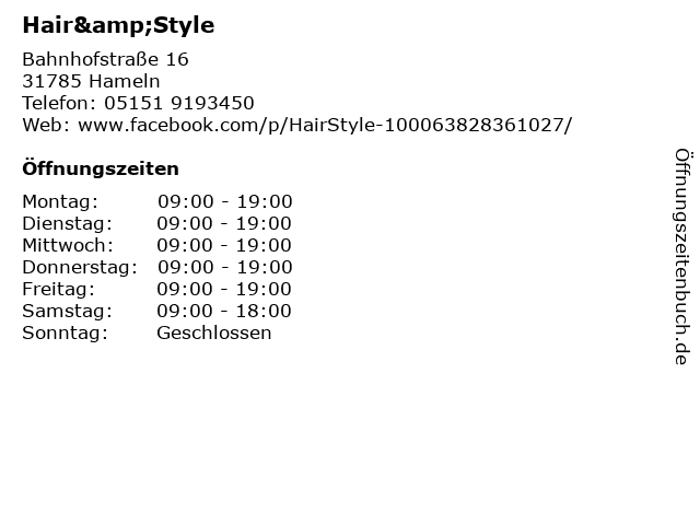| Öffnungszeiten Hair&Style in Hameln anzeigen | |