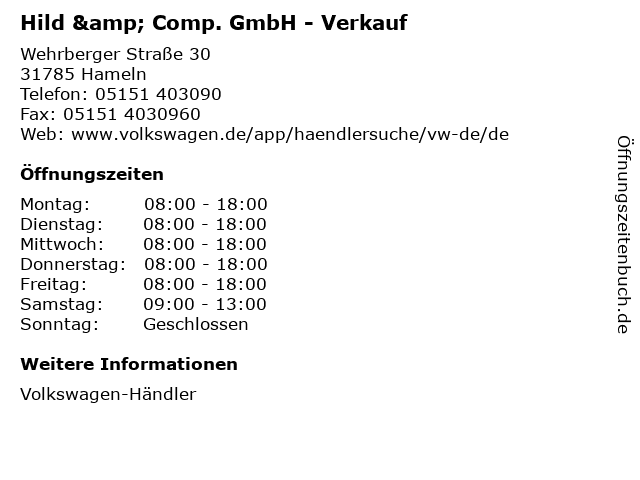 | Öffnungszeiten Hild & Comp. GmbH - Verkauf in Hameln anzeigen | |