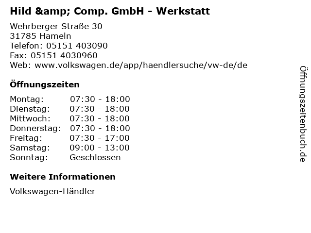 | Öffnungszeiten Hild & Comp. GmbH - Werkstatt in Hameln anzeigen | |