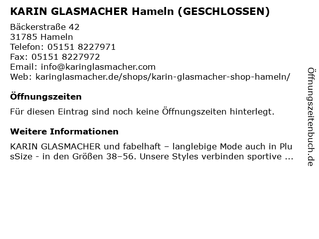 Branchen & Suchbegriffe zu KARIN GLASMACHER Hameln (GESCHLOSSEN):geschlossen, glasmacher, hameln, karin |
