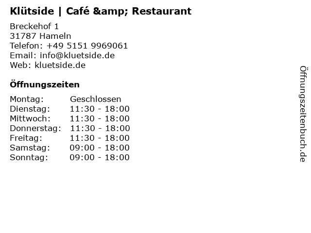 | Öffnungszeiten Klütside | Café & Restaurant in Hameln anzeigen | |