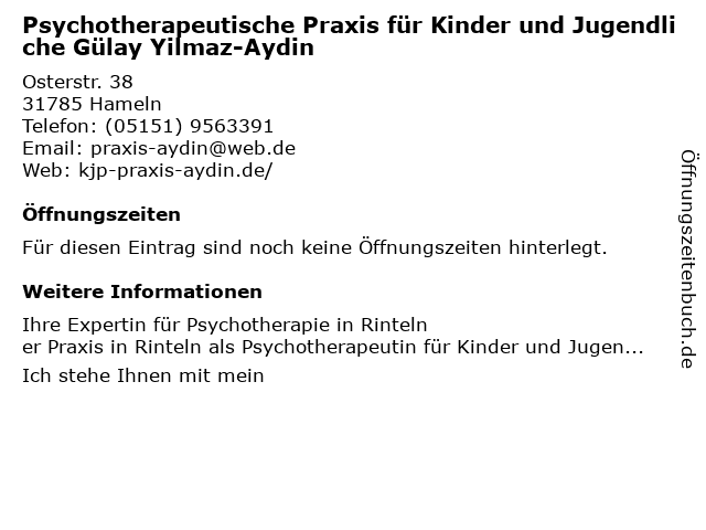 | Psychotherapeutische Praxis für Kinder und Jugendliche Gülay Yilmaz-Aydin anrufen | |