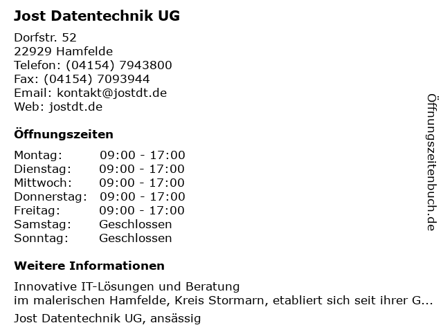 | Öffnungszeiten Jost Datentechnik UG in Hamfelde anzeigen | |