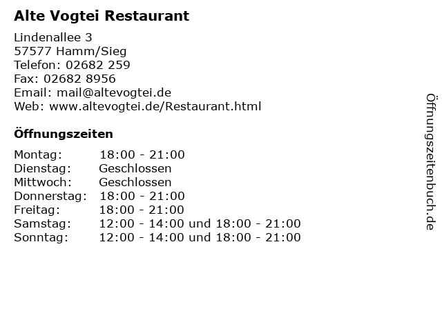 | Öffnungszeiten Alte Vogtei Restaurant in Hamm/Sieg anzeigen | |