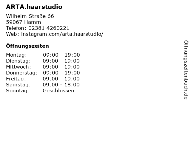 | Öffnungszeiten ARTA.haarstudio in Hamm anzeigen | |