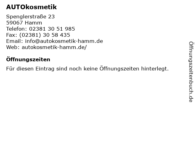 | Öffnungszeiten AUTOkosmetik in Hamm anzeigen | |