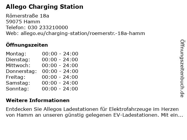 | Öffnungszeiten Allego Charging Station in Hamm anzeigen | |