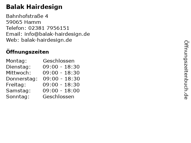 | Öffnungszeiten Balak Hairdesign in Hamm anzeigen | |
