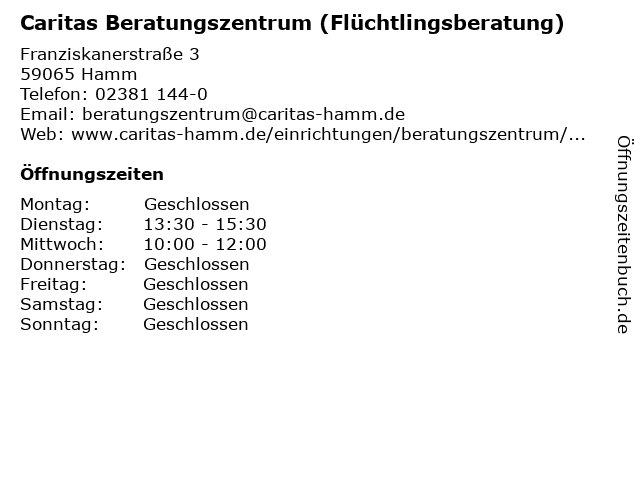 1 Caritas Beratungszentrum (Wohnungsnotfallhilfe) (Entfernung: 0,00 km) Franziskanerstraße 3, 59065 Hamm 5 Caritasverband für den Kreis Coesfeld e.V., Caritas-Werkstattladen (Entfernung: 12,97 km) Moormannplatz 6, 59368 Werne 6 Evangelische Beratungszentrum Schwangerschaftskonfliktberatung der Diakonie Ruhr-Hellweg (Entfernung: 13,13 km) Fürstenhof 27, 59368 Werne |