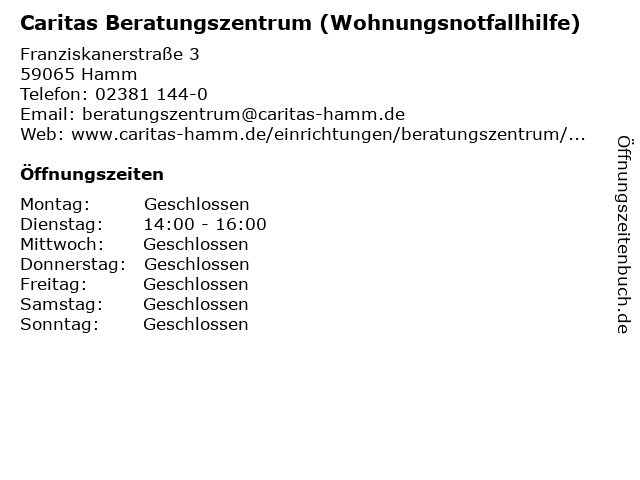 2 Caritas Beratungszentrum (Flüchtlingsberatung) (Entfernung: 0,00 km) Franziskanerstraße 3, 59065 Hamm 5 Wohnungsnotfallhilfe Hamm Caritasverband für die Stadt Hamm e.V. (Entfernung: 2,52 km) Sorauer Str. 14, 59065 Hamm 6 |