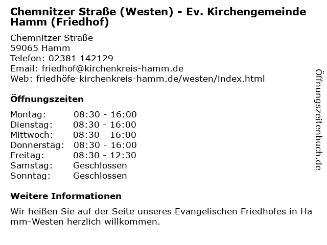Branchen & Suchbegriffe zu Chemnitzer Straße (Westen) - Ev. Kirchengemeinde Hamm (Friedhof):chemnitzer, ev., friedhof, kirchengemeinde, straße, westen |