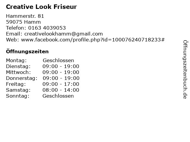 | Öffnungszeiten Creative Look Friseur in Hamm anzeigen | |