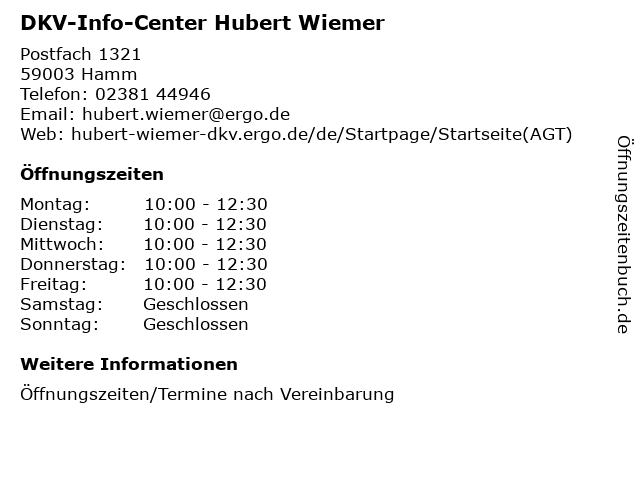| Öffnungszeiten DKV-Info-Center Hubert Wiemer in Hamm anzeigen | |