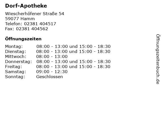 | Öffnungszeiten Dorf-Apotheke in Hamm anzeigen | |