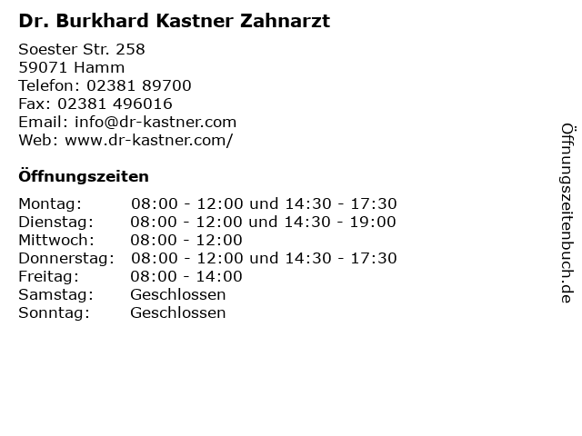 | Öffnungszeiten Dr. Burkhard Kastner Zahnarzt in Hamm anzeigen | |