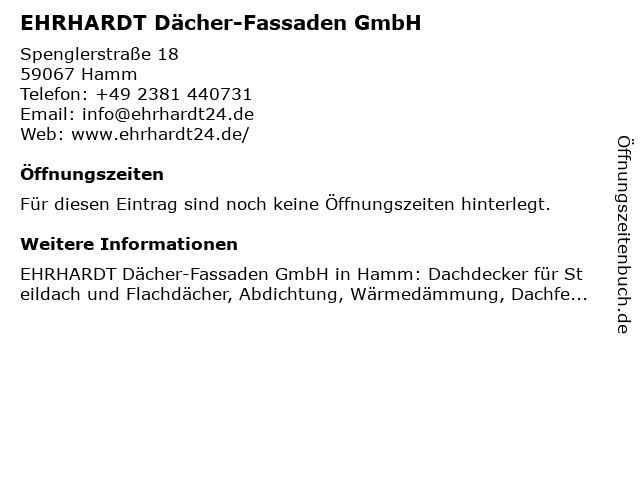 | Öffnungszeiten EHRHARDT Dächer-Fassaden GmbH in Hamm anzeigen | |