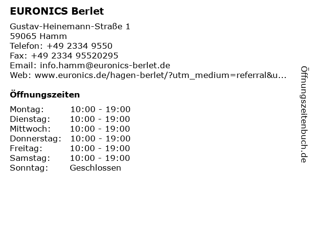 | Öffnungszeiten EURONICS Berlet in Hamm anzeigen | |