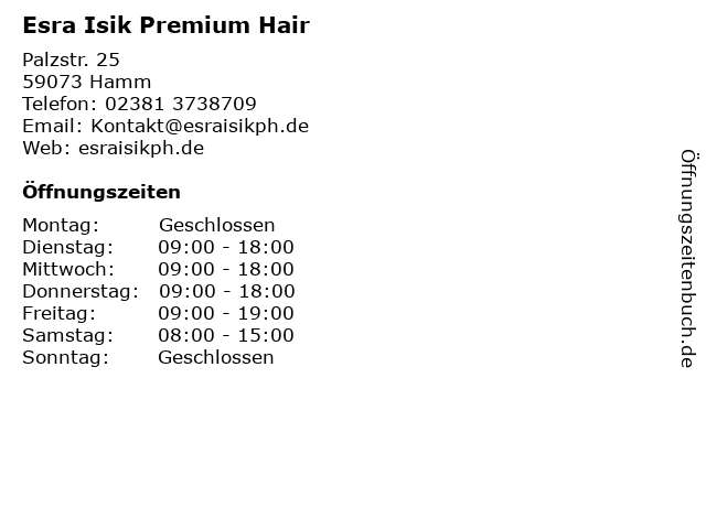 | Öffnungszeiten Esra Isik Premium Hair in Hamm anzeigen | |