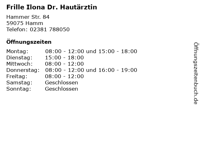 | Telefonnummer Frille Ilona Dr. Hautärztin in Hamm (02381 788050) anrufen | |