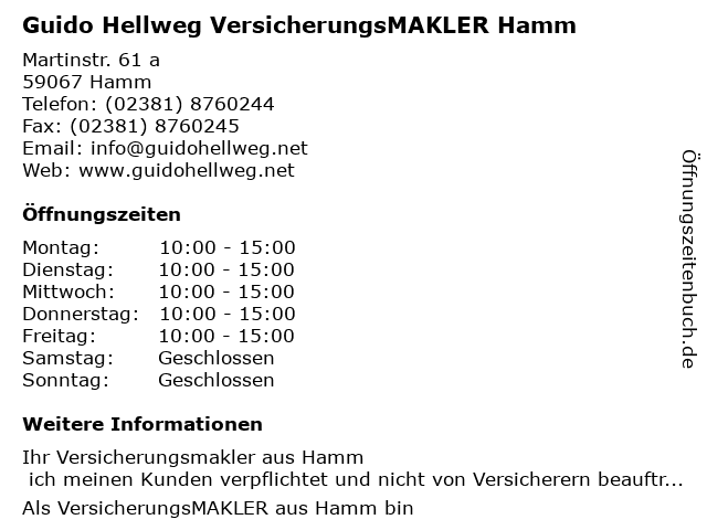 3 Steinhaus Versicherungsmakler GmbH Vertrieb von Versicherungen (Entfernung: 2,09 km) Dorchkamp 6, 59069 Hamm 5 Evangelische Beratungsstelle für Schwangerschaftskonflikte und Familienplanung der Diakonie Ruhr-Hellweg (Entfernung: 3,83 km) Südstraße 29, 59065 Hamm 6 |