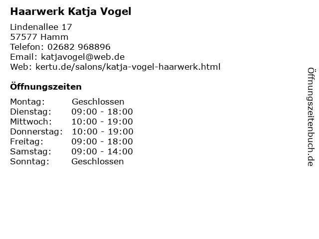 | Öffnungszeiten Haarwerk Katja Vogel in Hamm anzeigen | |
