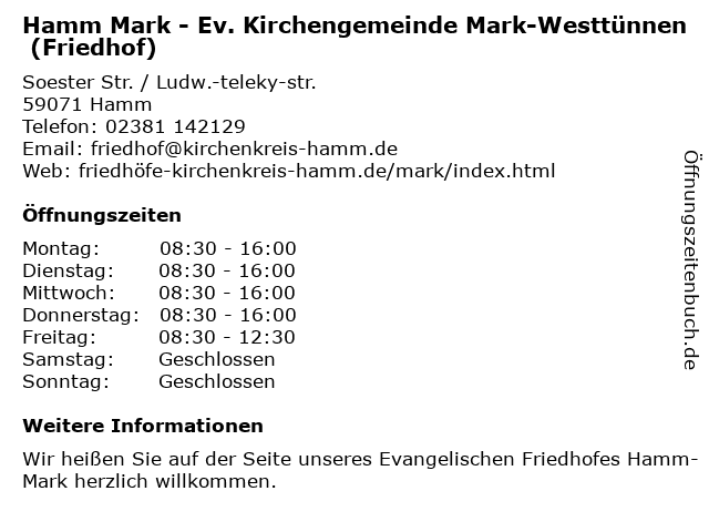 Branchen & Suchbegriffe zu Hamm Mark - Ev. Kirchengemeinde Mark-Westtünnen (Friedhof):ev., friedhof, kirchengemeinde, mark, westtünnen |