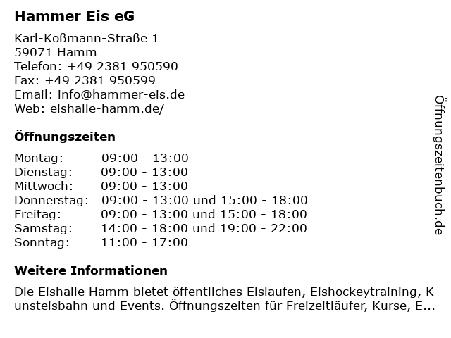| Öffnungszeiten Hammer Eis eG in Hamm anzeigen | |