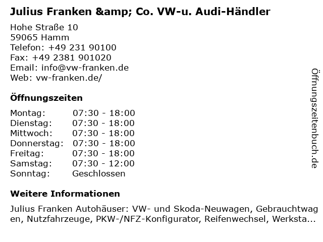 2 Kraftfahrzeugvertrieb Julius Franken & Co. Verkauf (Entfernung: 0,02 km) Hohe Straße 10-14, 59065 Hamm 3 Autohaus Julius Franken / Teiledienst und Service (Entfernung: 0,91 km) Richard-Wagner-Straße 12, 59063 Hamm 4 Nutzfahrzeuge Franken | Julius Franken & Co. KG (Verkauf) (Entfernung: 0,91 km) Richard-Wagner-Str. 12, 59065 Hamm 5 Nutzfahrzeuge Franken | Julius Franken & Co. KG (Teile & Zubehör, Service) (Entfernung: 0,91 km) Richard-Wagner-Straße 12, 59065 Hamm 6 |