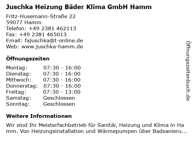 1 2 Heinz-Jürgen Freytag-Silke Medizinische Bäder- und Massagepraxis (Entfernung: 3,37 km) Friedrich-Ebert-Str. 9, 59075 Hamm 4 Heizung, Klima, Sanitär Conrad Krause GmbH & Co. KG (Entfernung: 14,56 km) Marie-Curie-Str. 9, 59423 Unna 6 |