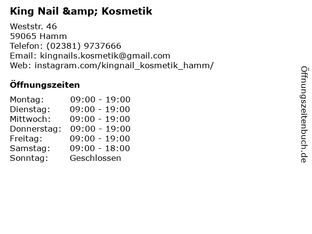 | Öffnungszeiten King Nail & Kosmetik in Hamm anzeigen | |