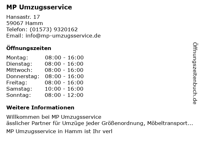 | Öffnungszeiten MP Umzugsservice in Hamm anzeigen | |