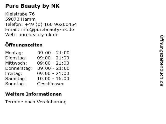 | Öffnungszeiten Pure Beauty by NK in Hamm anzeigen | |