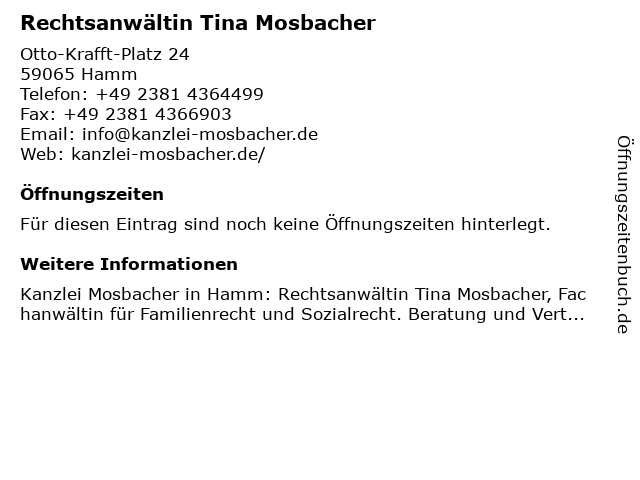 | Öffnungszeiten Rechtsanwältin Tina Mosbacher in Hamm anzeigen | |