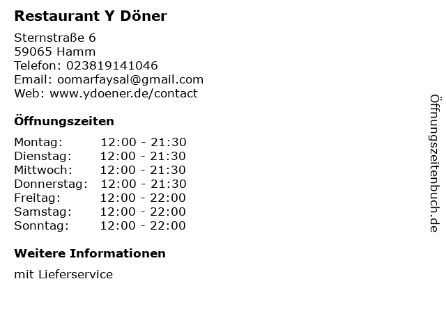 | Öffnungszeiten Restaurant Y Döner in Hamm anzeigen | |