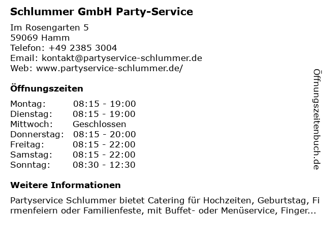 | Öffnungszeiten Schlummer GmbH Party-Service in Hamm anzeigen | |