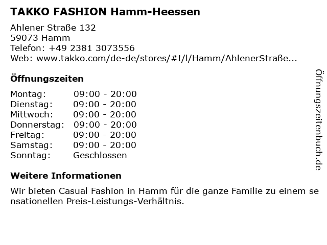 | Öffnungszeiten TAKKO FASHION Hamm-Heessen in Hamm anzeigen | |