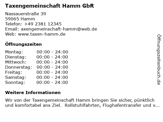 | Öffnungszeiten Taxengemeinschaft Hamm GbR in Hamm anzeigen | |
