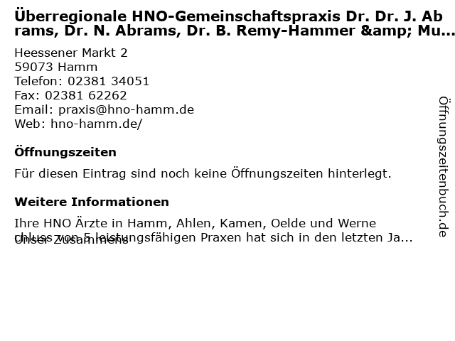 Überregionale HNO-Gemeinschaftspraxis Dr. Dr. J. Abrams, Dr. N. Abrams, Dr. B. Remy-Hammer & Mu Dr. L. Valiyeva anrufen | |