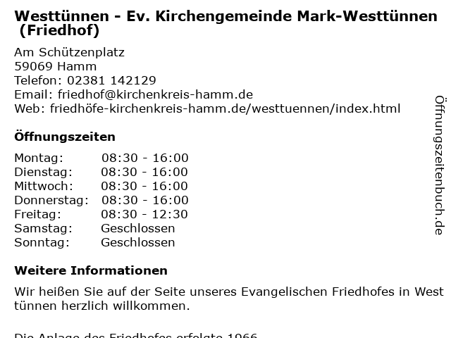 Branchen & Suchbegriffe zu Westtünnen - Ev. Kirchengemeinde Mark-Westtünnen (Friedhof):ev., friedhof, kirchengemeinde, mark, westtünnen |