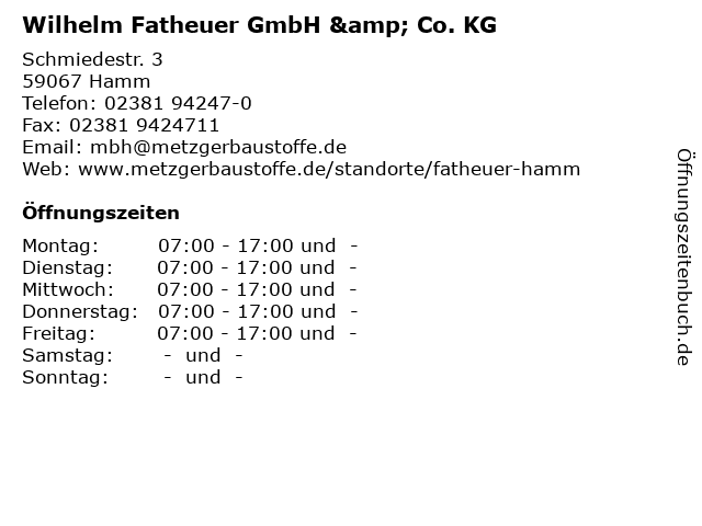 | Öffnungszeiten Wilhelm Fatheuer GmbH & Co. KG in Hamm anzeigen | |