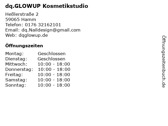 | Öffnungszeiten dq.GLOWUP Kosmetikstudio in Hamm anzeigen | |