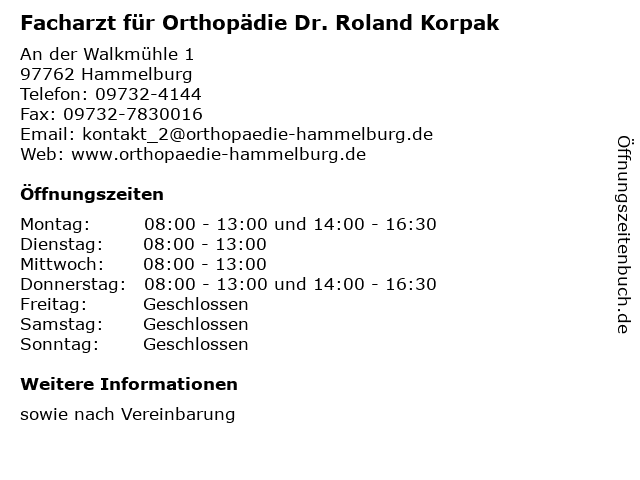 1 Dr. Roland Korpak - Facharzt für Orthopädie (Entfernung: 0,70 km) An der Walkmühle 1, 97762 Hammelburg 6 |