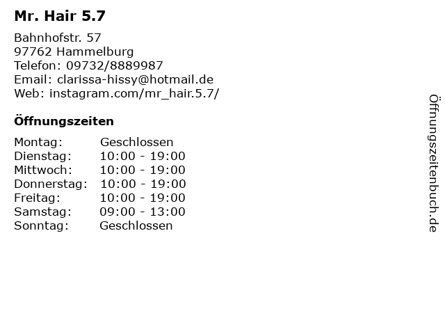 | Öffnungszeiten Mr. Hair 5.7 in Hammelburg anzeigen | |