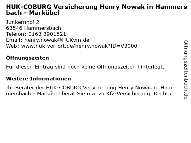| HUK-COBURG Versicherung Henry Nowak in Hammersbach - Marköbel anrufen | |